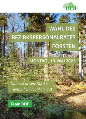 In den Anlagen finden Sie unsere Flyer mit dem "Team BDF" für die Wahl des Bezirkspersonalrats Forsten und für die Wahl des Gesamtpersonalrats bei der ZdF.